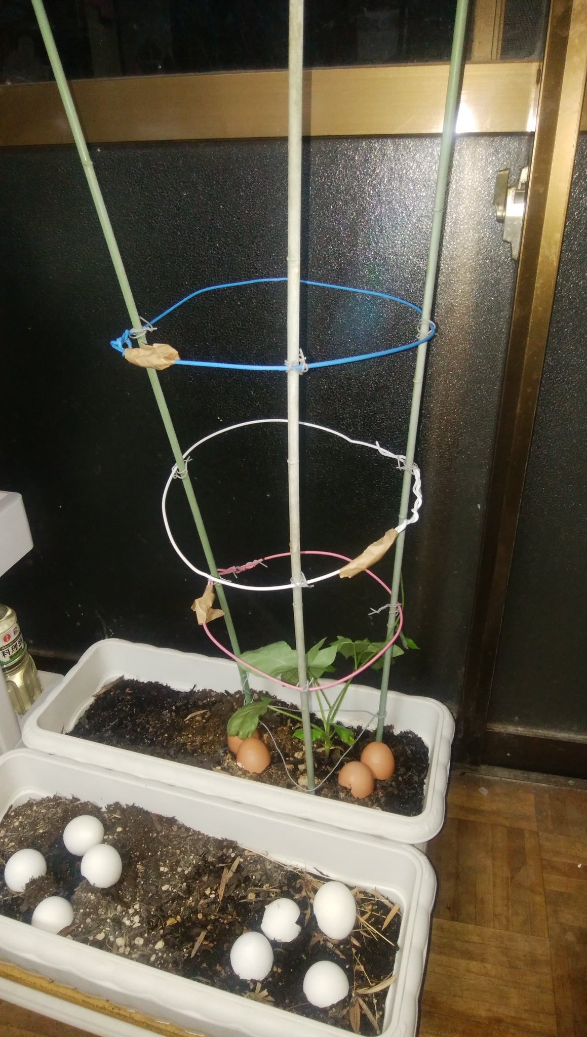 ごう 昨日 嫁が子供が植えた朝顔に網張るための棒あまってるのとって来て って言うけどその棒って太いし 植木鉢 無理だったから 家であるもので代用 細い棒でも植木鉢にはささらないから三本柱にし ハンガーで代用 針金出てるとこは子供触ると危険